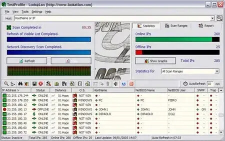 Look @ LAN é uma aplicação portátil que permite ao usuário monitorar o que os clientes estão conectados a uma rede local. Look @ LAN irá exibir os endereços IP de qualquer computador conectado à rede local e determinar se as máquinas estão online ou offline e pode indicar se o computador está usando um sistema operacional Windows ou não. Você pode limitar a varredura varia com base no endereço IP, o adaptador de rede, ou tipos de porta. Além disso, o utilitário de navios com ping, traceroute, e um visualizador de rede baseado em árvore já construída dentro